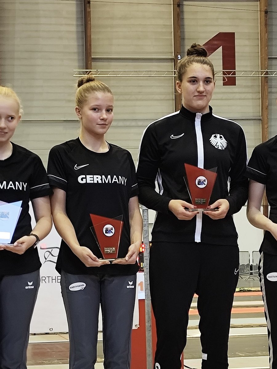 Das Damendegen-Team um Marie Stumpf, Katie Busch, Maria Herz und Anna Sünderhauf präsentierte sich stark. Nach einem souveränen Sieg im 32er gegen das Team aus Rumänien setzten sie sich mit 45:32 gegen die zweite polnische Mannschaft durch. Im Viertelfinale ließen sie auch den Schweizerinnen keine Chance und gewannen mit 45:37. Im Halbfinale wartete dann die erste Vertretung Polens, die unsere Mädels ebenfalls souverän mit 45:38 besiegten. Erst im Finale mussten sie sich einer starken Auswahl aus Tschechien geschlagen geben. Nachwuchs-Bundestrainer Dirk Schiffler sagte zufrieden: „Diese komplett neue Mannschaft konnte nahtlos an die letztjährigen Erfolge bei den Kadetten CCs anschließen und zum 5. mal in Folge im Damendegen eine Medaille bei einem Kadetten CC gewinnen. Das war ein sehr erfreulicher Start in die neue Saison!“