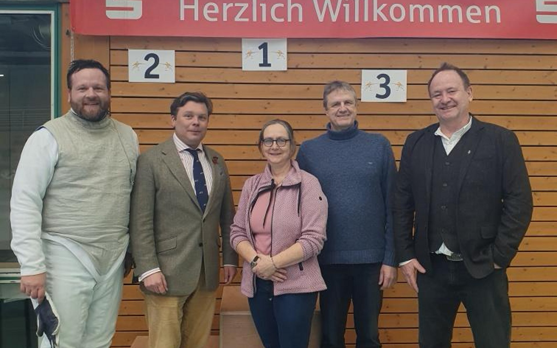 Bild 2: Kilian Küsters (Pressereferent TV Haueneberstein Abteilung Fechten), Benjamin Denzer (DFB-Präsident), Ilsabé Franke (Cheftrainerin TV Haueneberstein und Mitglied im Vorstand des Südbadischen Fechterbundes), Patrick Bruns (Vorstandsmitglied TV Haueneberstein), Swen Strittmatter (Vorsitzender des Südbadischen Fechterbundes).