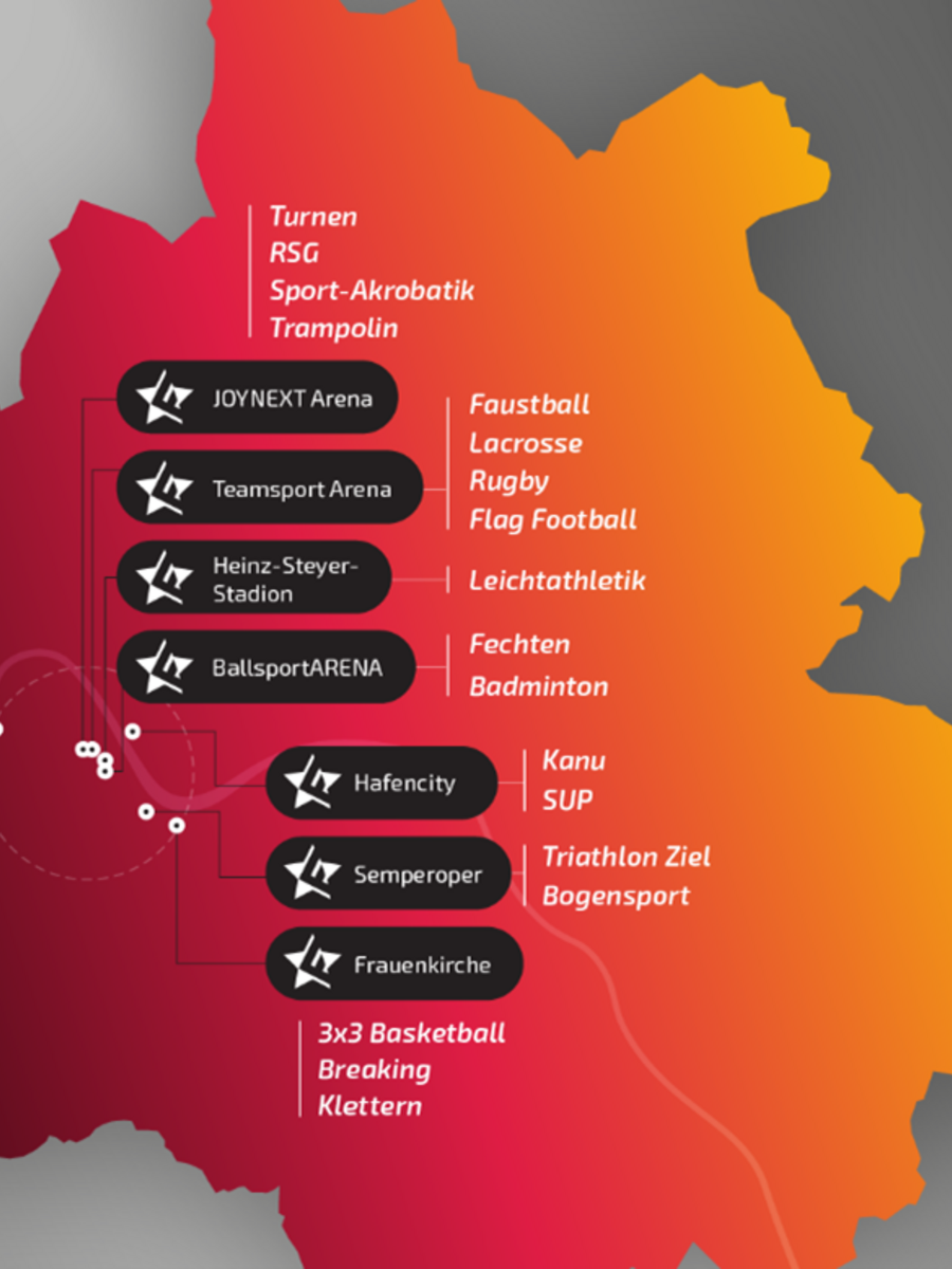 Dirk Hilbert, Oberbürgermeister der Stadt Dresden, sagt: „Wir werden die Finals 2025 in Dresden ganz nah zu den Menschen bringen. Das haben wir mit der Auswahl der Sportstätten geschafft. Die Kanu-Wettbewerbe in der Hafencity stellen sicher, dass wir allen Interessierten einen Platz an der Strecke bieten können, denn diese Sportart hat eine große Tradition in Dresden. Zudem bin ich dankbar, dass wir auch die Herausforderungen auf dem Theaterplatz meistern und die Wettbewerbe im Bogenschießen und Triathlon auf diesem atemberaubenden Platz stattfinden können.“