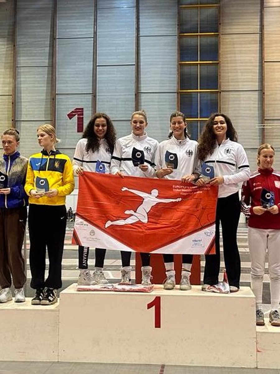 Das Damendegen-Team Germany (Daria Yoosefi, Cagla Aytekin, Lea Marie Stumpf, Matilda Kunisch) Türkei4, Ukraine5 und Polen2 deutlich und zieht ins Halbfinale ein. Hier trifft man auf Germany2 (Eda Cevikol, Mia Lebrenz, Lisa-Marie Nüsseler, Greta Neuber), die zuvor über Italien2, Ukraine3 und Ukraine4 triumphiert hatten. Team1 gewinnt und erreicht das Finale. Nach einem spannenden Kopf-an-Kopf-Duell gegen die ukrainischen Fechterinnen sichert sich das deutsche Team mit 45:40 die Goldmedaille. Team2 muss sich auch im nächsten Gefecht gegen Polen geschlagen geben und belegt Platz vier.