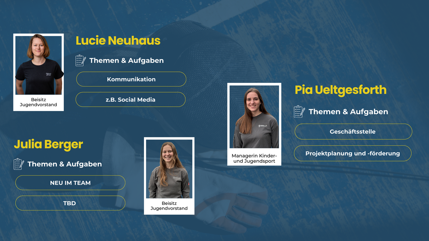 Komplettiert wird das Vorstandsteam durch Pia Ueltgesforth, Managerin Kinder- und Jugendsport, die hauptberuflich die Maßnahmen und Projekte der Deutschen Fechtsportjugend koordiniert und die Jugendgeschäftsstelle leitet.