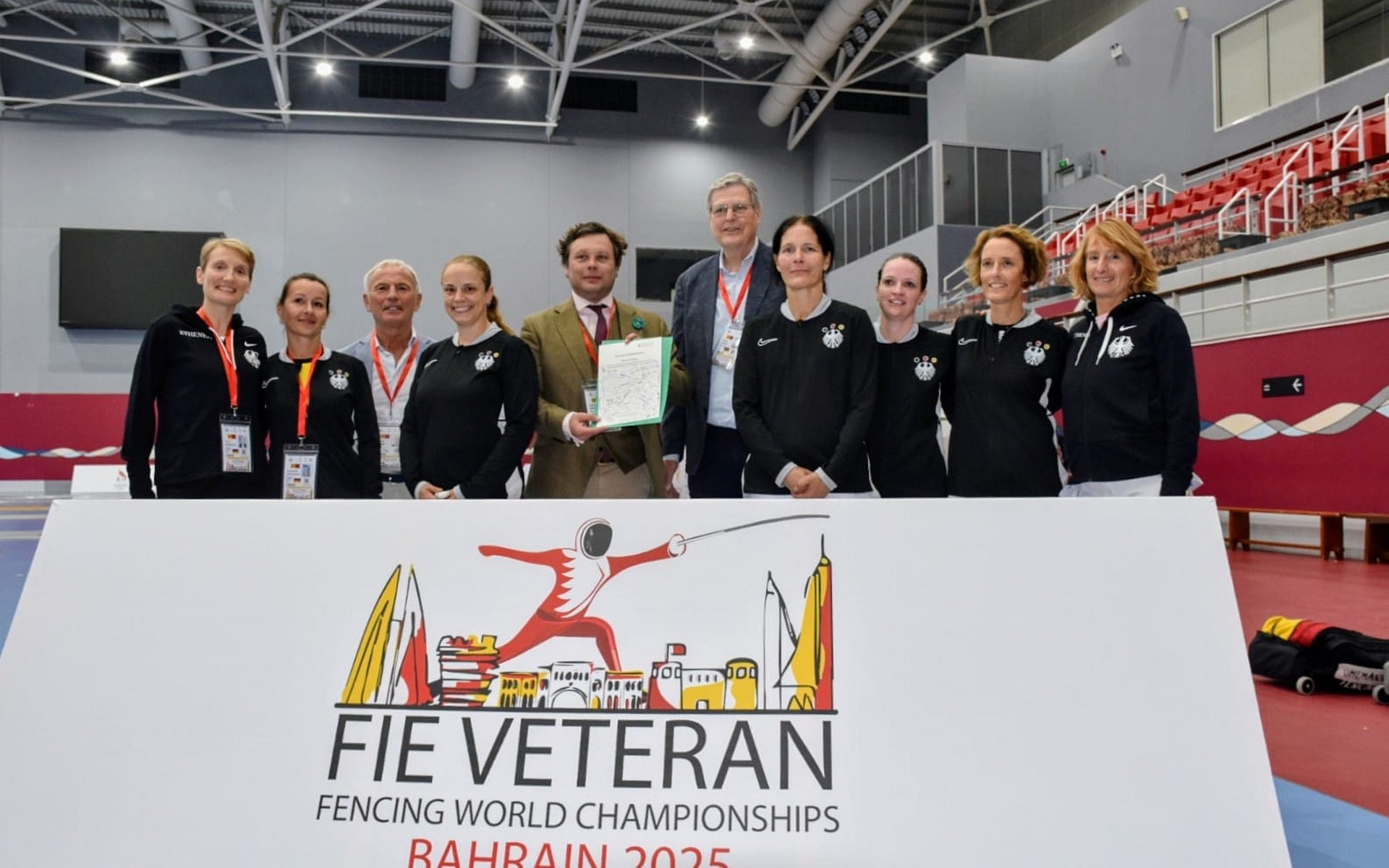 Der letzter Tag der Veteranen-Weltmeisterschaft war nochmal ein Höhepunkt! Vizepräsident Dieter Lammer und DFB-Präsident Benjamin Denzer, der heute seinen Geburtstag feiert, unterstützten die Mannschaft. Zum Abschluss übergab Veteranensprecher Dr. Harald Lüders im Namen des gesamten Teams eine Dankesurkunde. Besonders freute sich der DFB-Präsident über das Ständchen der Mannschaft nach dem letzten Treffer. In seinen Dankesworten würdigte der Präsident das große Engagement und herausragende Abschneiden der deutschen Veteranenfechter/innen bei diesen Weltmeisterschaften. „Unser Veteranenteam hat noch einmal mehr gezeigt, dass es zur internationalen Spitzenklasse zählt und auch ein wichtiger Teil der Fechtfamilie des DFBs ist. Meinen Geburtstag zusammen mit unseren Fechterinnen und Fechtern, den Trainer/innen, Betreuer/innen und Unterstützern zu verbringen ist für mich das schönste Geschenk”, so der DFB-Präsident.