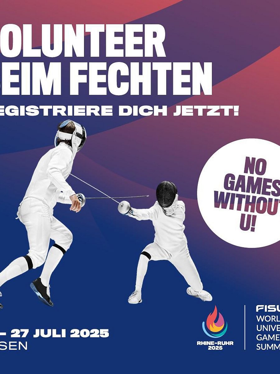 Wer als Volunteer bei den FISU World University Games Summer Rhine Ruhr 2025 dabei sein möchte, sollte sich spätestens bis zum 15.September 2024 unter diesem Link registrieren . Weitere Informationen sind HIER zu finden Für allgemeine Fragen kann man sich an diese Mail-Adresse wenden: volunteer@rhineruhr2025.com Für fechtspezifische Fragen wendet euch bitte an: ralph-botho.orschel@rhineruhr2025.com