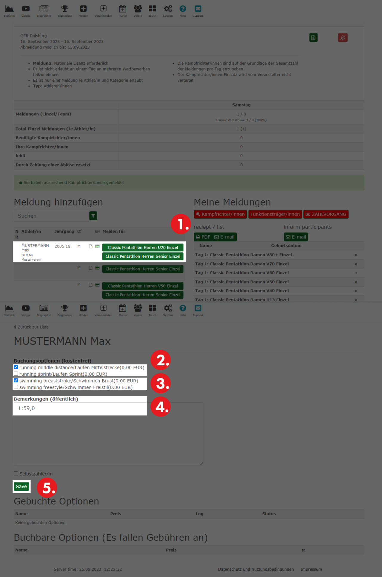 Nach der Auswahl des Wettbewerbes kommt man zur Buchungsseite. Diese Sachen könnt ihr sofort eintragen oder später nachholen (Button mit dem Blatt und Stift bei dem jeweiligen Athleten anklicken unter “Meine Meldungen”)
