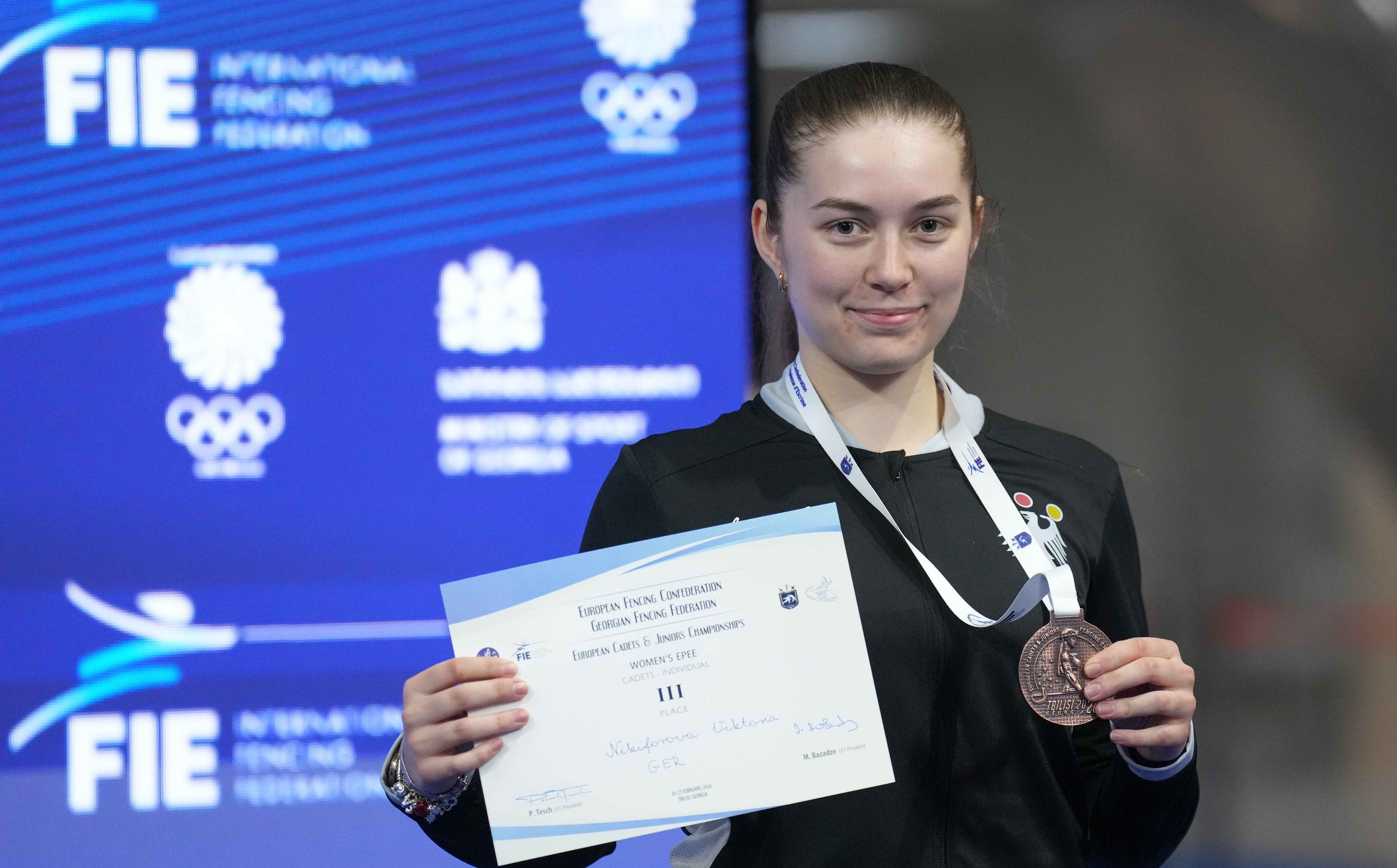 Am zweiten Tag der Europameisterschaften der U17/Kadetten und U20/Junioren im georgischen Tiflis hat Degenfechterin Viktoria Nikiforov für die erste deutsche Medaille gesorgt.
