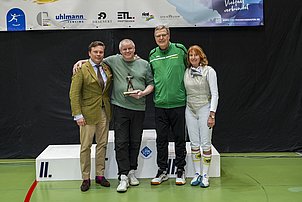 Laki Dobridis übergab den, von Altseniorensprecher Franz Hirt gestifteten Wanderpreis an den erfolgreichen Seniorenfechter. Hanns Prechtl – ein Fecht-Urgestein in Bayern hatte in jugendlichen Jahren mit dem Fechtsport begonnen, gab seine Fechterfahrung an viele Kinder und Jugendliche weiter und ist mit heute über 70 Lebensjahren ein immer noch gefürchteter Gegner bei Aktiventurnieren. 20x war ihm der Titel Bayerischer Meister sicher und so verfügt der Linkshänder heute noch über viele Fechttechniken in allen 3 Waffen.