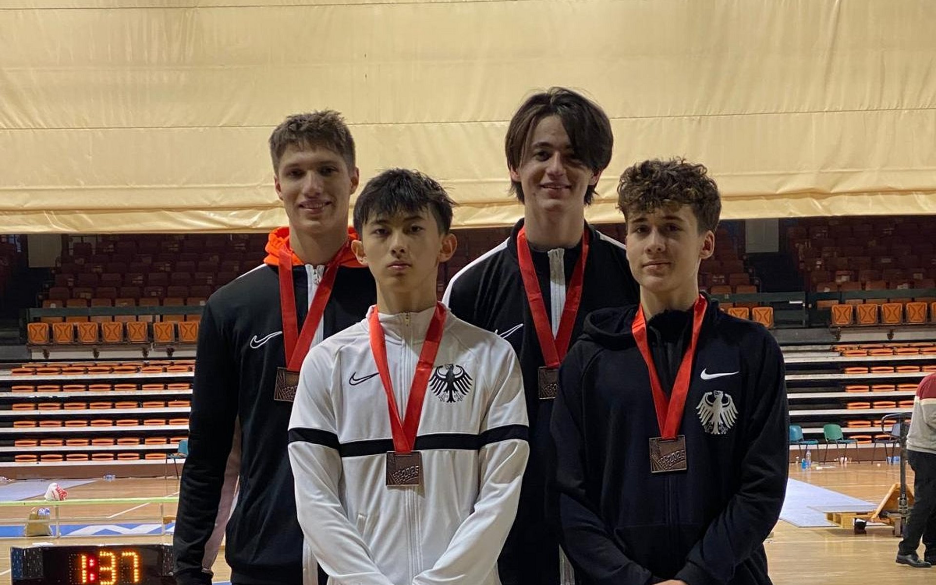 Dort wartete eine der drei starken Mannschaften aus Ungarn auf unsere Nachwuchsfechter. In dem erwartet engen Halbfinalgefecht konnten sich die jungen Deutschen zwischenzeitlich mit vier Punkten absetzen (25:21), diesen Vorsprung aber leider nicht bis zum Gefechtsende halten. Am Ende unterlagen Deng, Hummel, Schlickenrieder und Schuller den Ungarn knapp mit 42:45