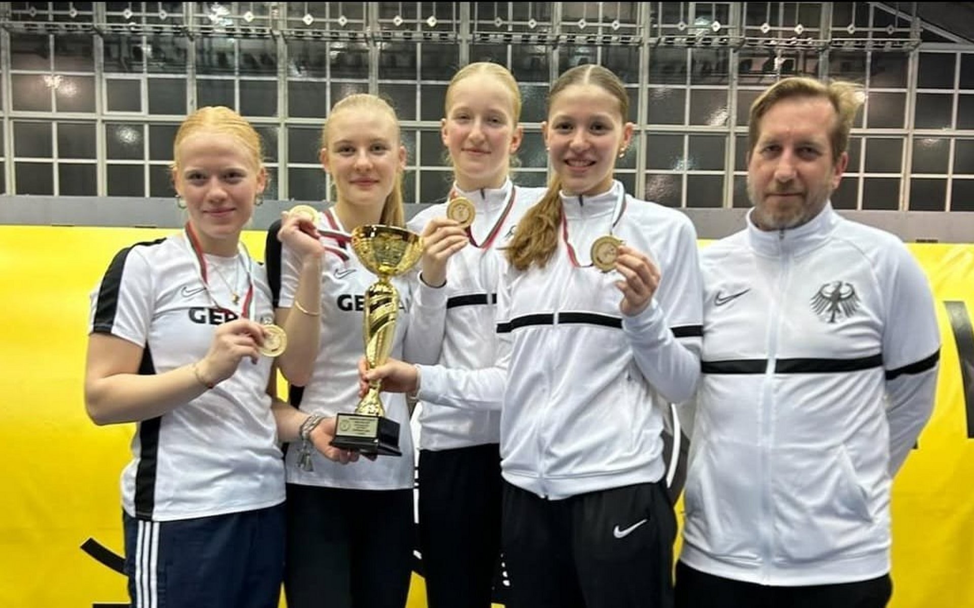 Marie Bach, Florentine Grund, Merle Herwig und Emma Klostermann gewannen beim CC Teamwettbewerb in Sofia am Sonntag die Goldmedaille. Das deutsche Quartett besiegte im Finale Ungarn nervenstark mit 45:42. In der Vorschlussrunde ließen die DFB-Kadettinnen der Türkei beim 45:28 keine Chance. Noch deutlicher wurden die Gastgeberinnen aus Bulgarien im Viertelfinale ausgeschaltet (45:13). Zum Auftakt hatte das Team Rumänien zwei mit 45:13 besiegt.