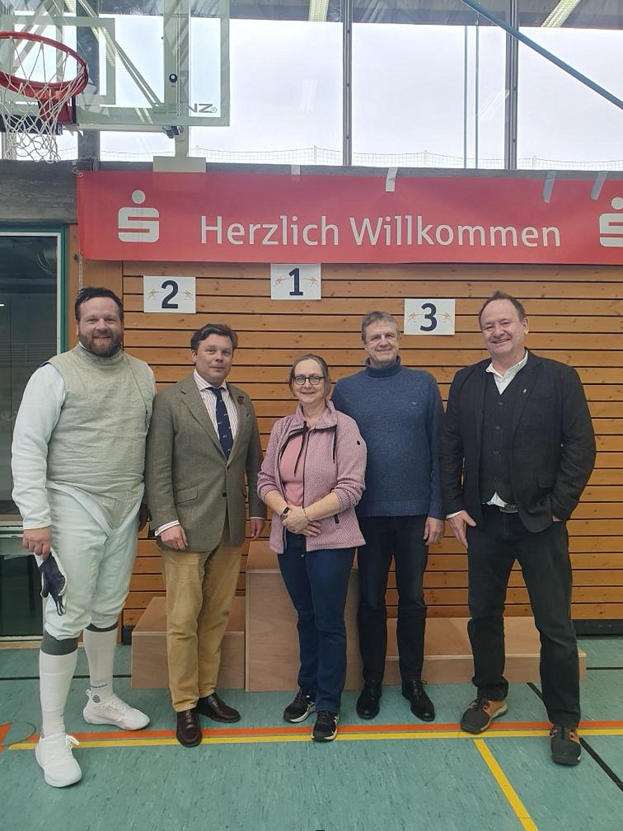Bild 2: Kilian Küsters (Pressereferent TV Haueneberstein Abteilung Fechten), Benjamin Denzer (DFB-Präsident), Ilsabé Franke (Cheftrainerin TV Haueneberstein und Mitglied im Vorstand des Südbadischen Fechterbundes), Patrick Bruns (Vorstandsmitglied TV Haueneberstein), Swen Strittmatter (Vorsitzender des Südbadischen Fechterbundes).