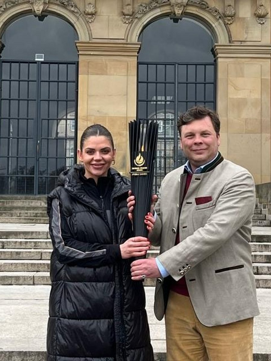 DFB-Präsident Benjamin Denzer nutze die Gelegenheit und nahm die Fackel in der Stuttgarter Innenstadt entgegen, das Bild entstand vor dem neuen Schloss in der Innenstadt. Gemeinsam mit der Olympionikin Pamela Dutkiewicz-Emmerich (Teilnahme bei den Olympischen Spielen in Rio 2016 im Hürdenlauf) freute sich der DFB-Präsident auf die Spiele, die im kommenden Juli im Ruhrgebiet stattfinden. Die FISU World University Games sind die Weltspiele der Studenten, eines der größten Multisport-Events der Welt.