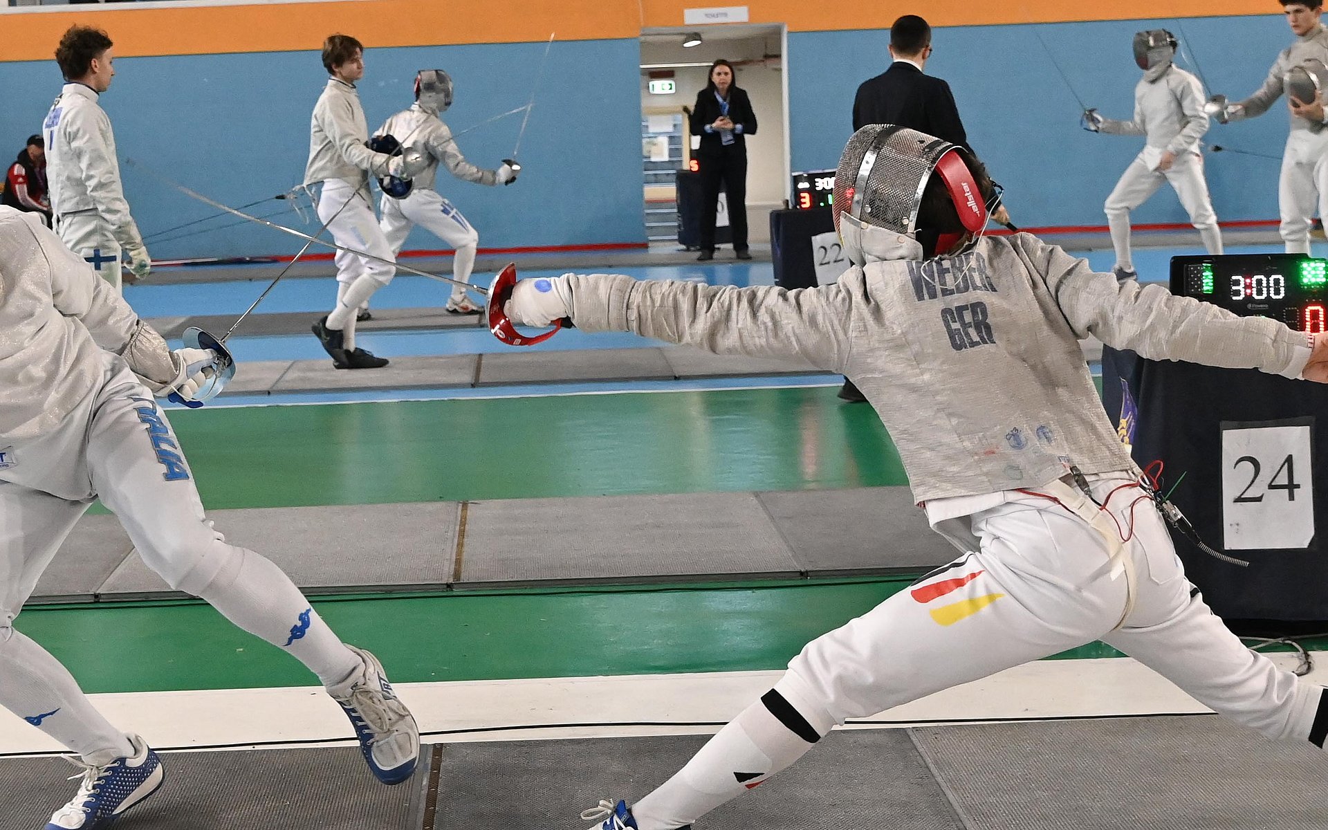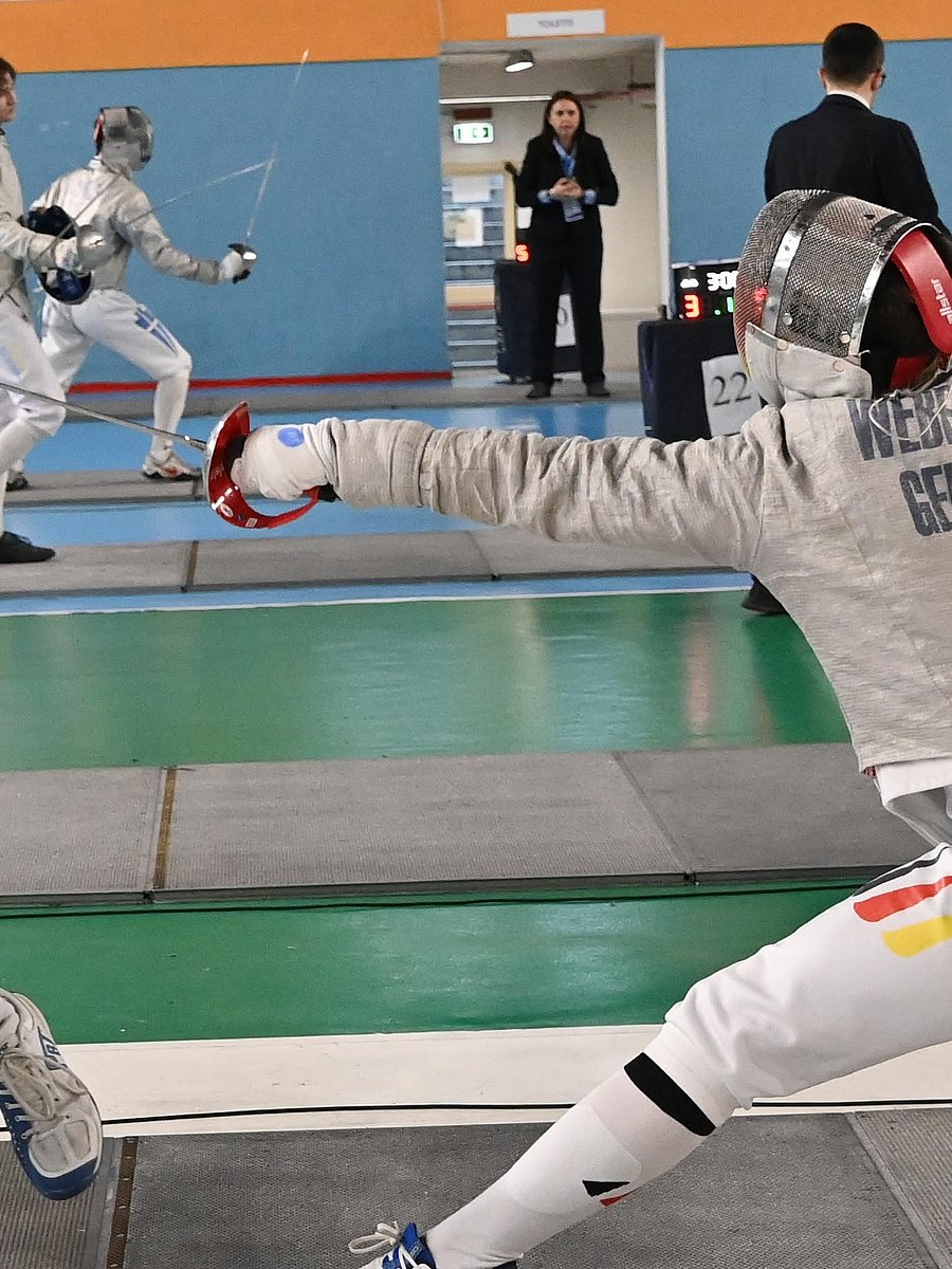 Für das Trio aus Michael Bergert (Fechtclub Radebeul), Otto Beckmann (SV Angern) und Henrik Barby (Fechtclub Moers) läuft es von Anfang an rund. Bergert und Beckmann gewinnen alle Vorrundengefechte und auch Barby sichert sich mit nur einer Niederlage eine gute Ausgangsposition für das KO. Alle drei gewinnen ihr 64er souverän. Bergert besiegt dann Leon Gautier-Loftus (ITA) mit 15:8 deutlich. Im nächsten Gefecht unterliegt er mit 14:15 denkbar knapp Andor Kolos Zsogon (HUN), kann sich aber über Rang zehn freuen. Ebenso unglücklich muss sich Beckmann Thibault Gaven Mary (FRA) geschlagen geben. Kann er im 32er doch noch Nervenstärke beweisen und mit 15:14 triumphieren, gelingt ihm das im 16er nicht mehr und er wird zwölfter. Auch Barby schlägt im 32er Luca Juravle (ROU). Gegen Hunor Kosztolanyi (HUN) reicht es nicht ganz, er verliert mit 13:15 und landet auf Platz 14. Laureano Mehner (Fechtclub Moers) schafft es leider nicht über die Vorrunde hinaus und wird nach nur einem Sieg 71ter.