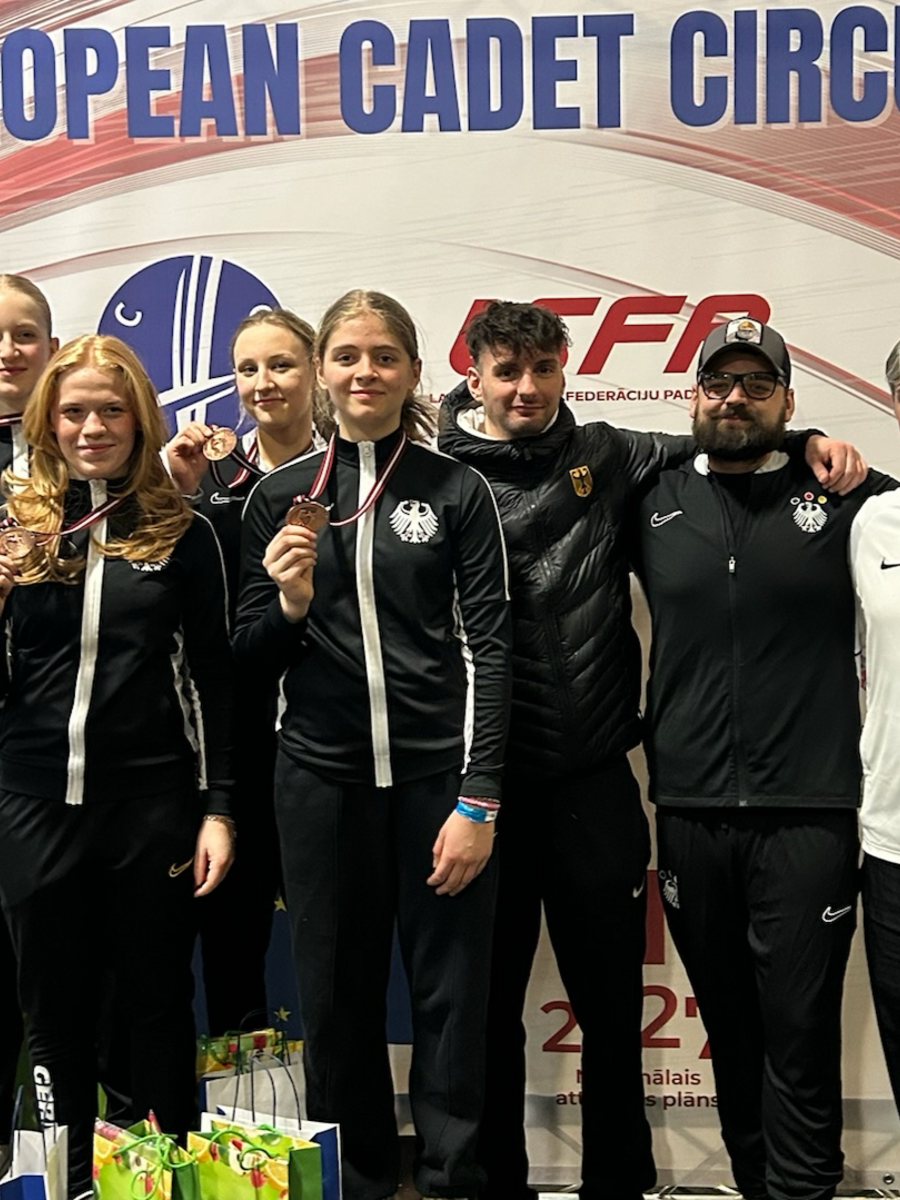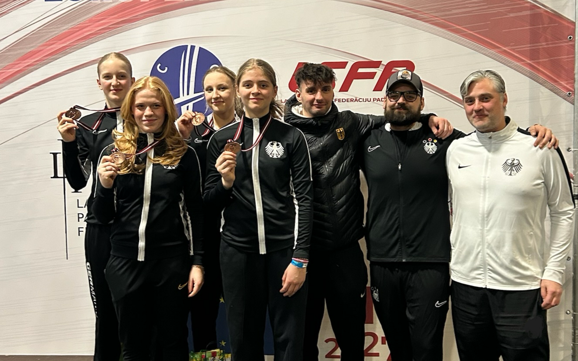 Unter 22 Teams im Damenflorett konnten sich Florentine Grund, Emma Klostermann, Ksenja Klimuk und Johanna Spinzig (im Foto von links nach rechts) einen starken dritten Platz sichern. Nach deutlichen Siegen über Polen und Israel traf man im Halbfinale auf die überlegenen Turniersiegerinnen aus den USA. Im Gefecht um Platz drei schlugen sie Großbritannien mit 45:32 und konnten die verdiente Bronzemedaille entgegennehmen.