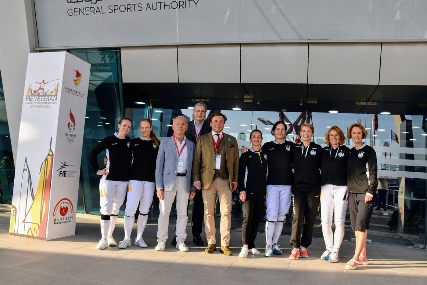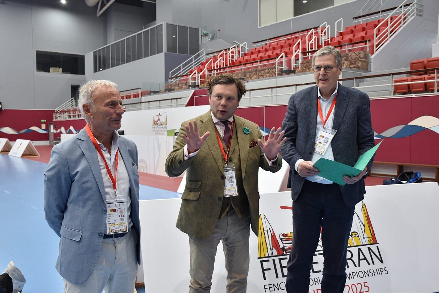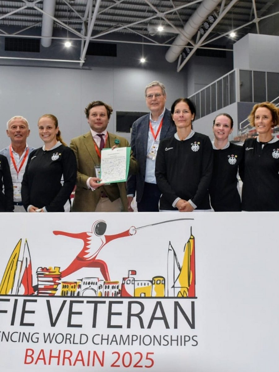 Der letzter Tag der Veteranen-Weltmeisterschaft war nochmal ein Höhepunkt! Vizepräsident Dieter Lammer und DFB-Präsident Benjamin Denzer, der heute seinen Geburtstag feiert, unterstützten die Mannschaft. Zum Abschluss übergab Veteranensprecher Dr. Harald Lüders im Namen des gesamten Teams eine Dankesurkunde. Besonders freute sich der DFB-Präsident über das Ständchen der Mannschaft nach dem letzten Treffer. In seinen Dankesworten würdigte der Präsident das große Engagement und herausragende Abschneiden der deutschen Veteranenfechter/innen bei diesen Weltmeisterschaften. „Unser Veteranenteam hat noch einmal mehr gezeigt, dass es zur internationalen Spitzenklasse zählt und auch ein wichtiger Teil der Fechtfamilie des DFBs ist. Meinen Geburtstag zusammen mit unseren Fechterinnen und Fechtern, den Trainer/innen, Betreuer/innen und Unterstützern zu verbringen ist für mich das schönste Geschenk”, so der DFB-Präsident.