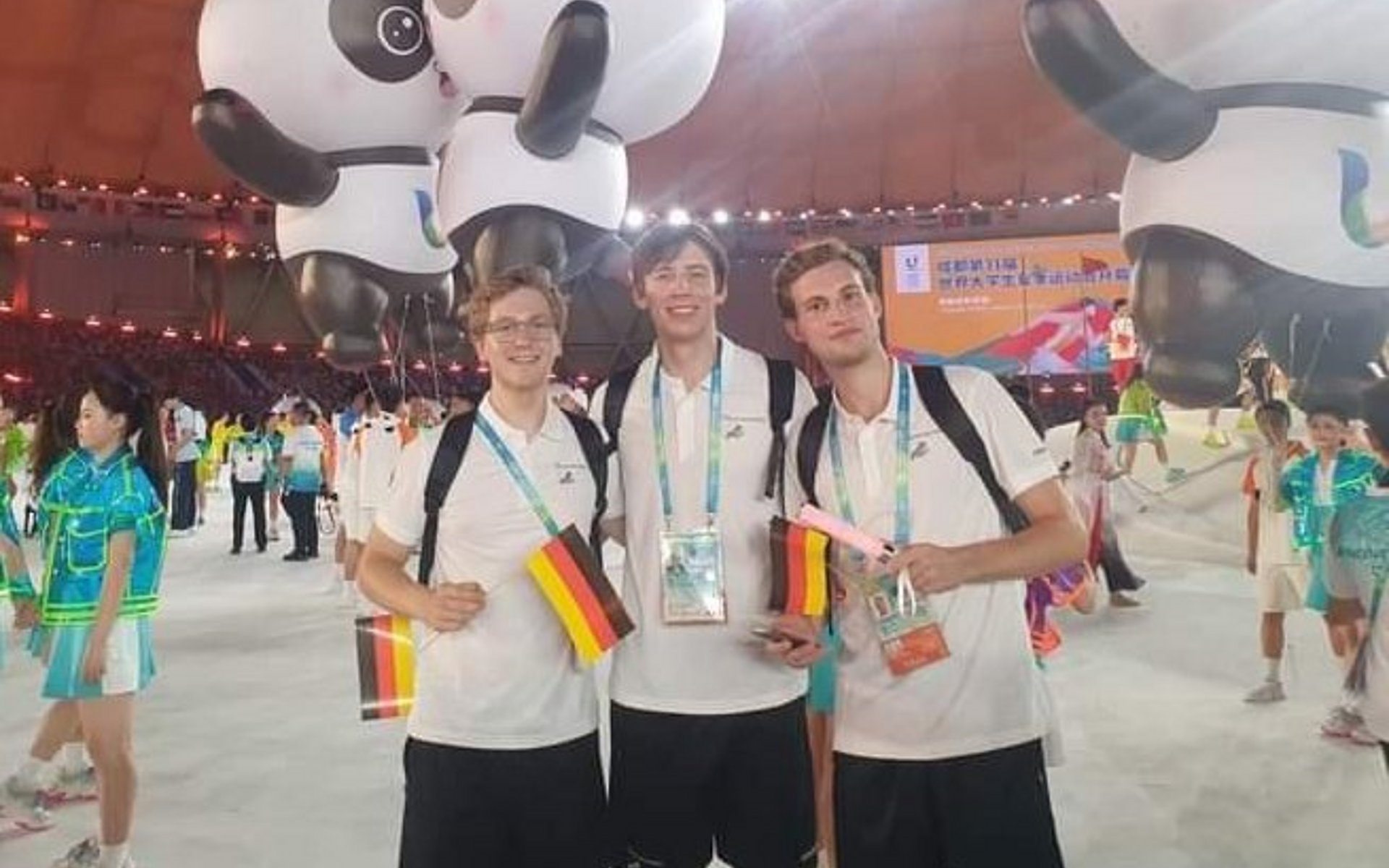 Bis auf Luis Bonah, der kurzfristig bei der WM in Mailand gestartet ist, waren sie bei der Eröffnungsfeier im Dong´an Lake Sports Park Stadium dabei. Max schildert seine Eindrücke: „Das war schon gigantisch, wir sind mit einer Bus-Kolonne dahingefahren worden. Der Einlauf ins Stadion war sehr beeindruckend, überall waren tanzende Menschen und auch sehr viele Zuschauer. Besonders war auch, dass der chinesische Präsident Xi Jinping die Spiele eröffnet hat. Es gab dann noch eine riesige Show mit verschiedenen Ensembles an Tänzern und einem großen Feuerwerk zum Abschluss und das ist echt ein tolles Gefühl, hier dabei zu sein“.