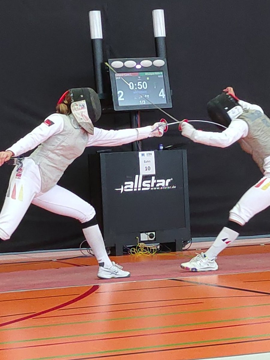Der Wettbewerb der Florettfrauen stand am Tag zwei des Burg-Cups auf dem Programm. Am Ende des Tages standen sich Aliya Dhuique-Hein (FC Tauberbischofsheim) und Luca Sarah Holland-Cunz (TSG Weinheim) gegenüber. Das Finale entwickelte sich zu einem wahren Krimi: nach der regulären Gefechtszeit stand die Begegnung 7:7 und das Gefecht ging in die Verlängerung. Etwas glücklich setzte Dhuique-Hein den Siegtreffer und holte den Turniersieg nach Tauberbischofsheim. Den dritten Platz teilten sich Kim Kirschen (SC Berlin) und Anna Sophie Kothieringer (KTF Luitpold München).